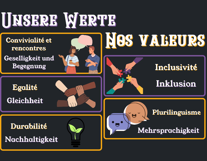 L’association "La Cigogne - Bar à jeux" a une volonté de créer un lieu de partage, d’échange, de découverte, ouvert à tous·tes. Elle a défini les valeurs ci-contre comme lignes directrices de l’association.
